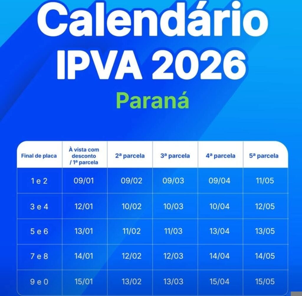 Os proprietários de veículos no Paraná já podem emitir as guias para pagamento do IPVA 2026. Quem pagar à vista recebe 6% de desconto sobre o total do imposto. O prazo para pagamento varia conforme o número final da placa, indo de 9 a 15 de janeiro de 2026. O valor do IPVA sofreu uma […]