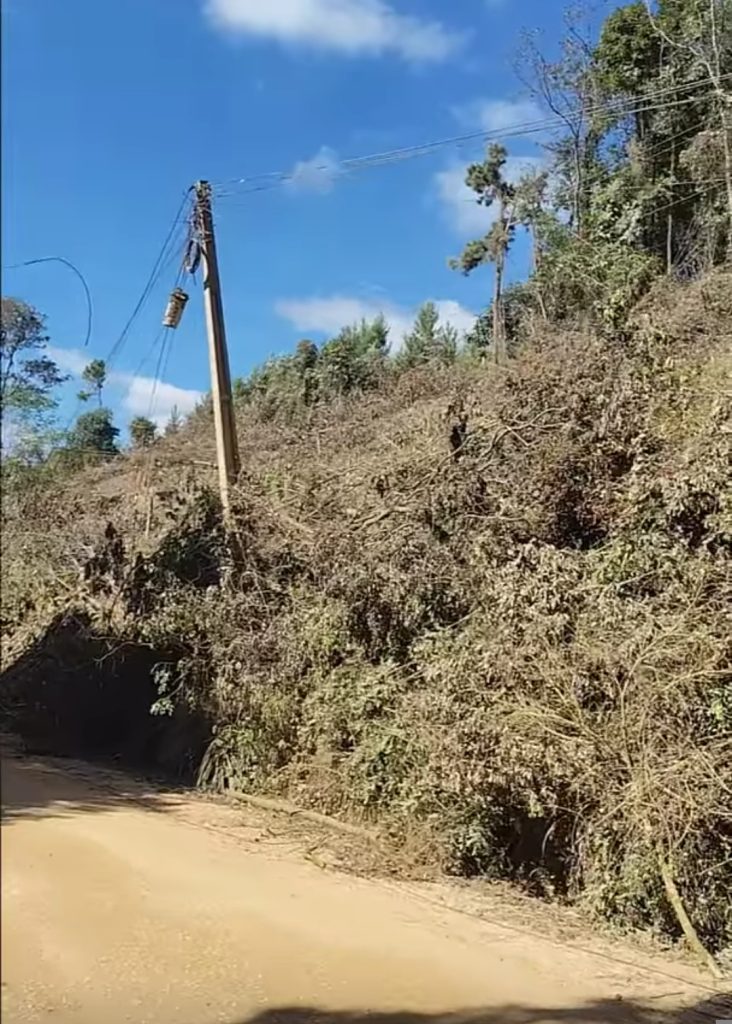 Na Estrada da Mina de Ferro, em Rio Branco do Sul, uma área desmatada provocou a queda de árvores sobre postes, derrubando os fios de internet e telefonia. Restos de pinus ainda estão espalhados pela estrada. Motoristas devem redobrar a atenção ao trafegar por esse trecho. Fonte: Jornal Expresso