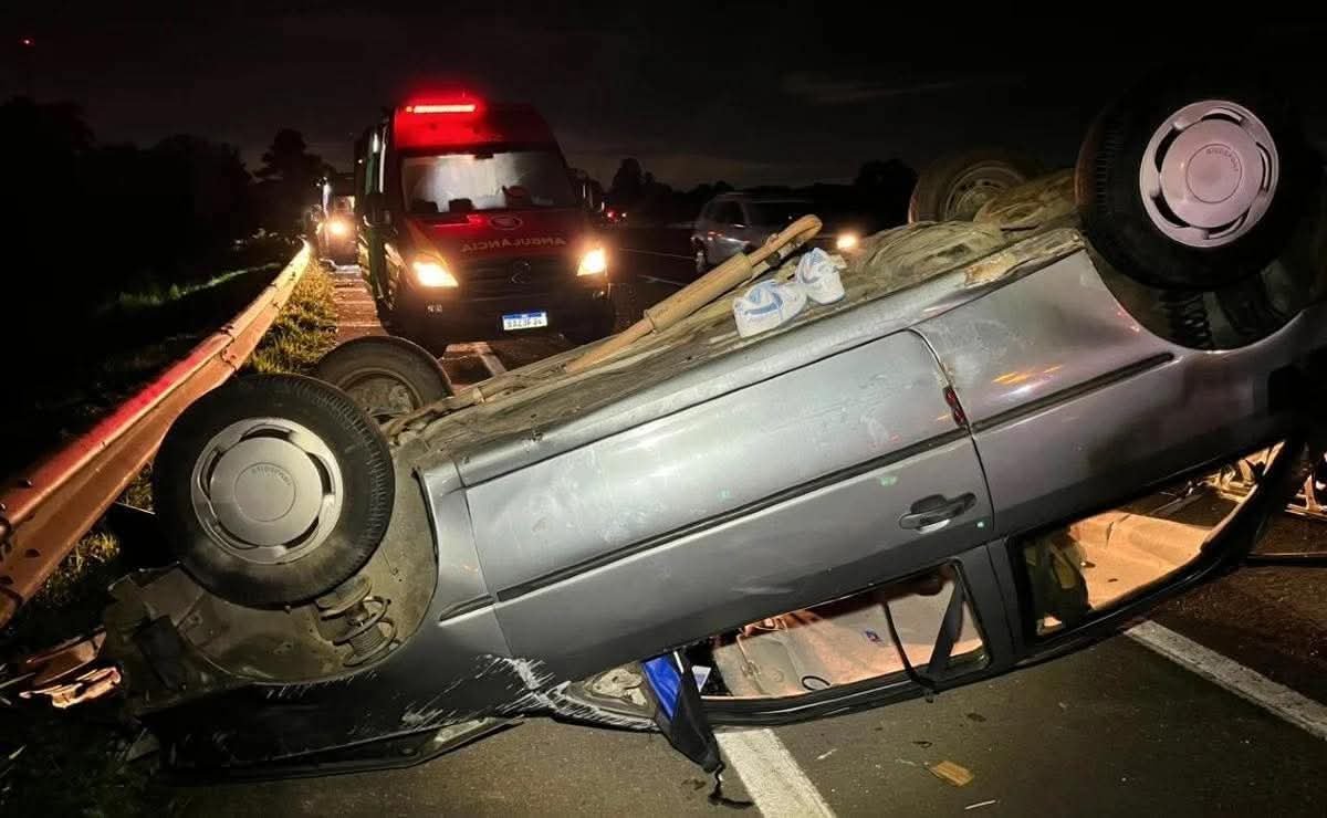 Um acidente grave ocorreu na madrugada deste domingo (1º) no km 76 da BR-277, em São José dos Pinhais, envolvendo dois carros e uma motocicleta, com seis pessoas feridas. De acordo com a Polícia Rodoviária Federal (PRF), um Renault Scenic atingiu uma moto e arrastou-a por cerca de 400 metros, depois colidiu na traseira de um Volkswagen Gol, que capotou. A família cubana que estava no Gol, incluindo duas crianças de 2 e 4 anos, ficou ferida. O casal que pilotava a motocicleta sofreu ferimentos graves e foi levado ao Hospital Universitário Cajuru, em Curitiba. O motorista do Scenic, 26 anos, e a passageira abandonaram o veículo e fugiram para uma área de mata ao lado da rodovia. A PRF encontrou sinais de consumo de álcool no carro, e o caso seguirá sob investigação.