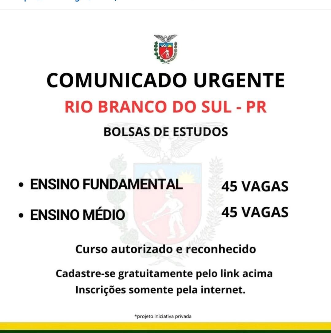 Estão abertas as inscrições para bolsas de estudos destinadas à conclusão do ensino fundamental e médio em Rio Branco do Sul, PR. Os interessados devem se inscrever exclusivamente pela internet, por meio do link: https://forms.gle/PkJQJVrUvaoMHBdB6. O cadastro é gratuito e os selecionados receberão informações posteriormente.