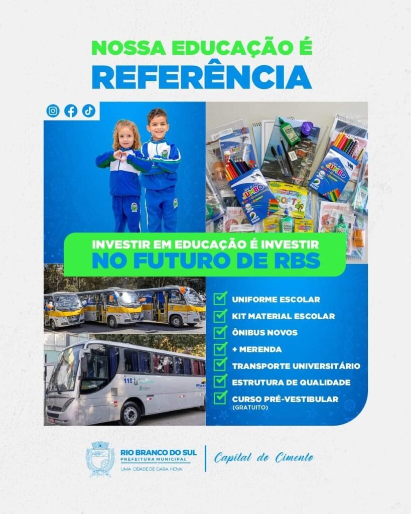 Rio Branco do Sul investe forte na educação dos alunos da rede municipal de ensino. Esse ano foram já foram investidos mais de 1 milhão de reais em novos ônibus escolares. A merenda escolar é acompanhada por nutricionistas para garantir uma excelente qualidade.