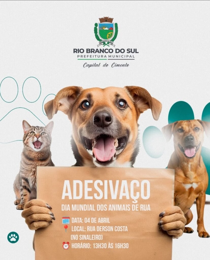 Rio Branco do Sul promove adesivaço de conscientização sobre animais de rua Nesta sexta-feira (04/04), a Prefeitura de Rio Branco do Sul realizará um adesivaço especial para conscientização sobre a causa animal. O evento acontecerá na Rua Derson Costa (no sinaleiro), das 13h30 às 16h30. A ação tem como objetivo alertar a população sobre os […]