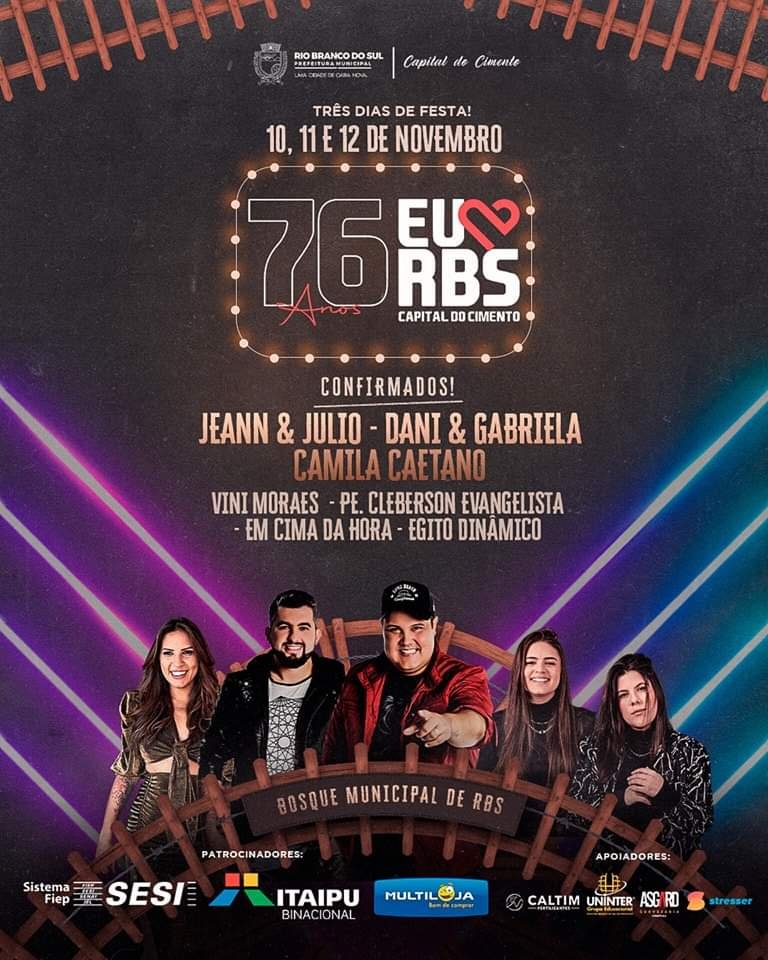 A festa para celebrar os 76 anos de emancipação de Rio Branco do Sul tem uma NOVA DATA! Marque no seu calendário: 10, 11 e 12 de Novembro. E não é só isso, foi preparado novas atrações incríveis!